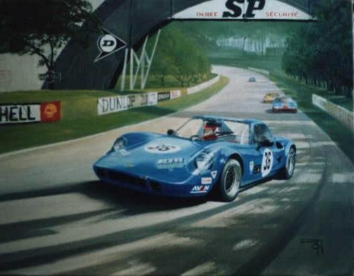 She had no idea of how she wanted the car depicted, so she left it to me. When I suggested the car be in action and possibly at Le Mans, she thought it would be perfect, as he loved the circuit but had never raced there.